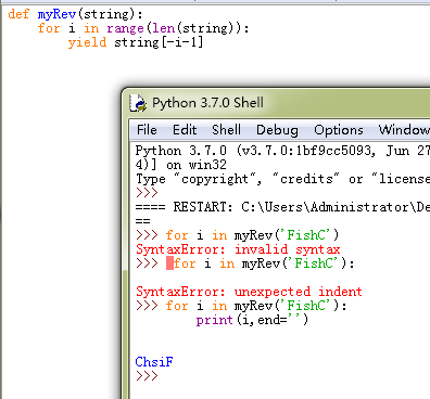 - >>> for i in myRev("FishC"):