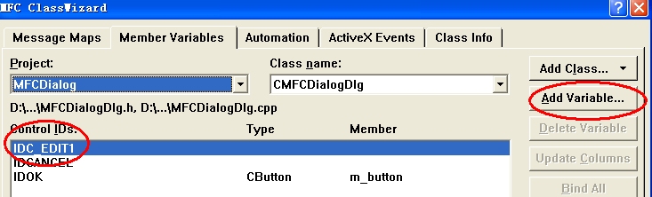 (如编辑框的内容,可定义CString类的某个具体变量与之绑定,通过刷新,可直接把变量显示到编辑框中。亦可通过刷新,把用户输入编辑框的内容,赋值给绑定变量。内容还可以绑定int类型。)